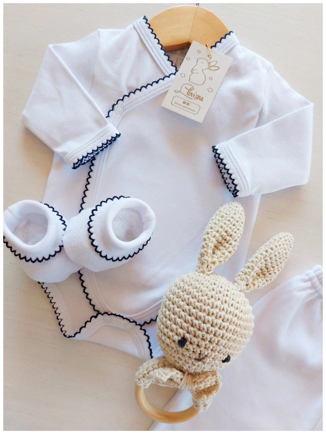 Te presentamos nuestro ajuar clasic pima blanco con picot azul para bebé. Hecho con manos de amor y pensado para todo el año. Confeccionado en algodón 100% , que se utilizan tanto en verano como en invierno. Te invitamos a conocerlo: