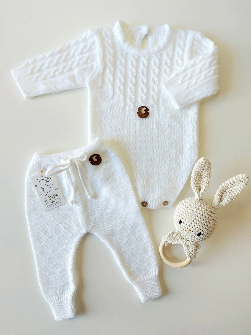 Este hermoso conjunto de lana hipoalergénica, diseñado para brindar suavidad y calidez sin irritar su piel delicada. Gracias a su tejido transpirable y ligero, tu bebé se sentirá cómodo y protegido en todo momento.