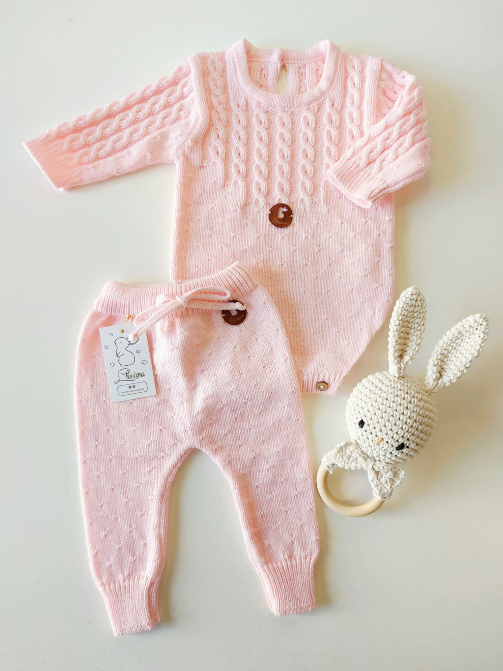 Este hermoso conjunto de lana hipoalergénica, diseñado para brindar suavidad y calidez sin irritar su piel delicada. Gracias a su tejido transpirable y ligero, tu bebé se sentirá cómodo y protegido en todo momento.