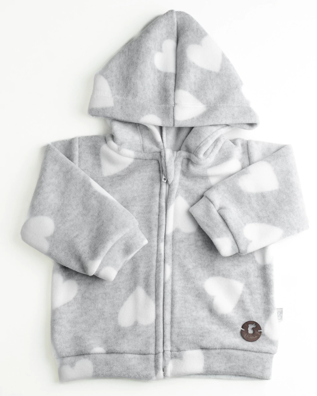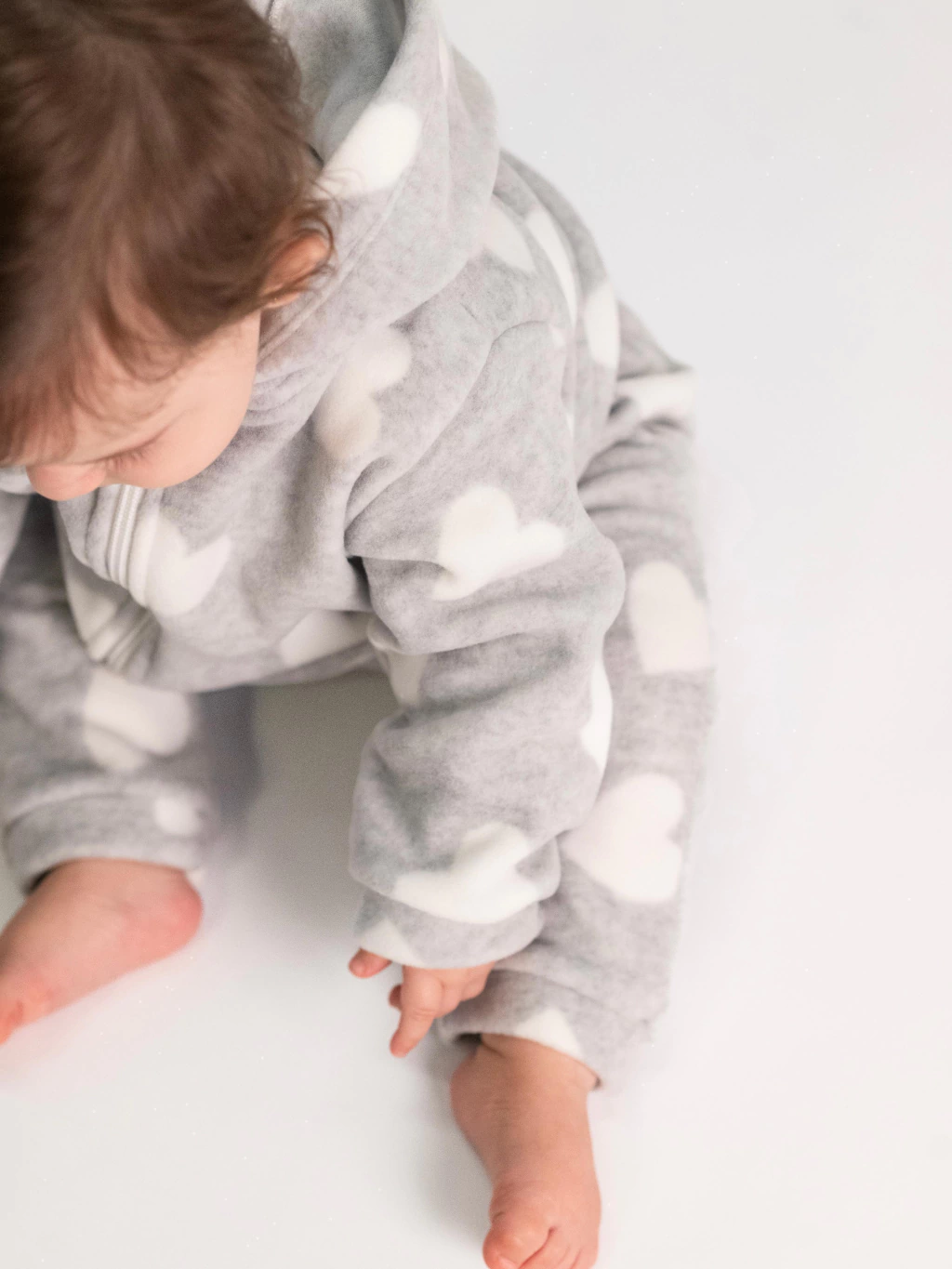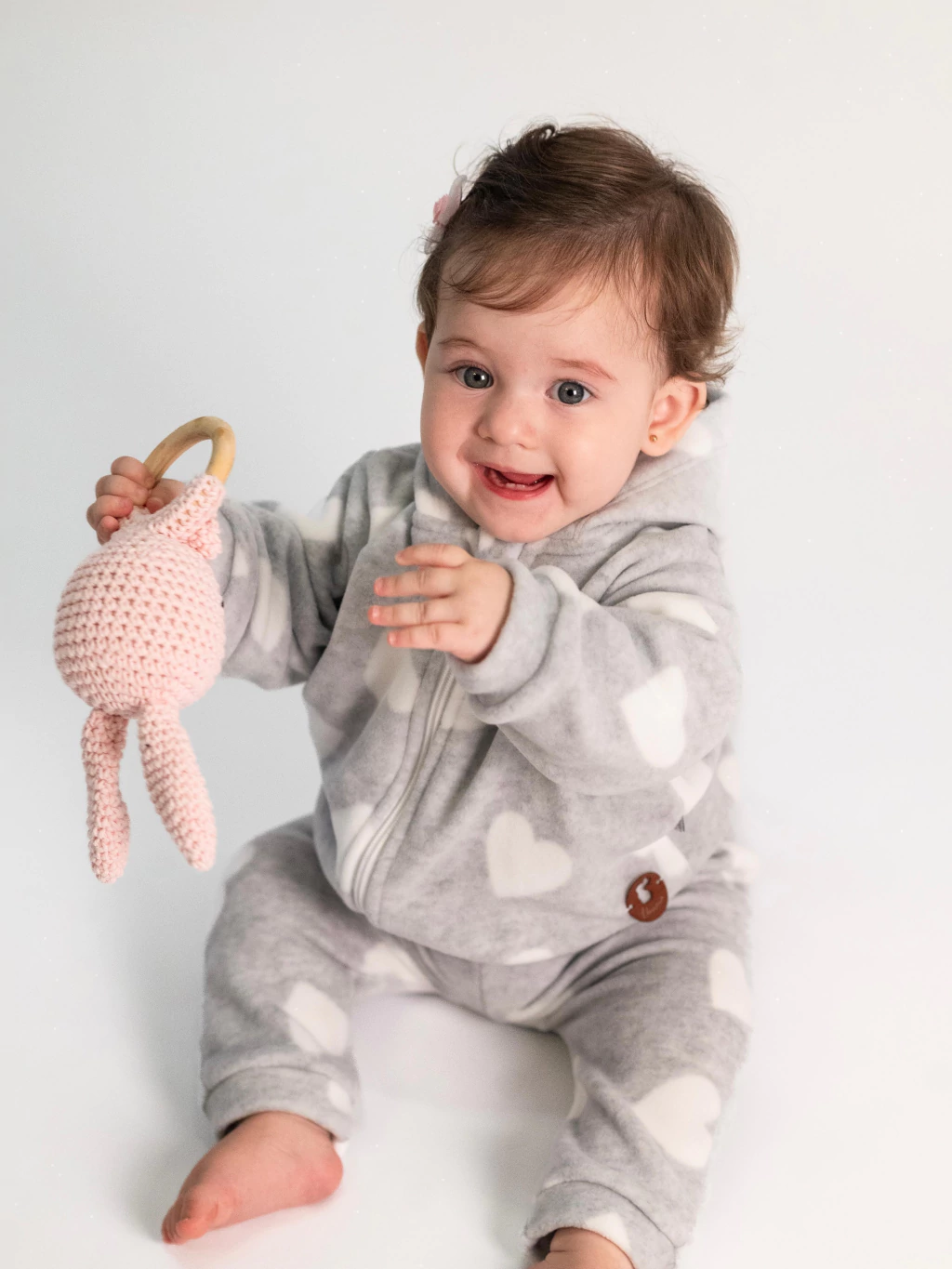Incluye dos prenditas esenciales: una camperita abrigada y un pantalón a juego, ambos en un encantador tono gris con dulces corazones blancos que lo hacen simplemente adorable.
