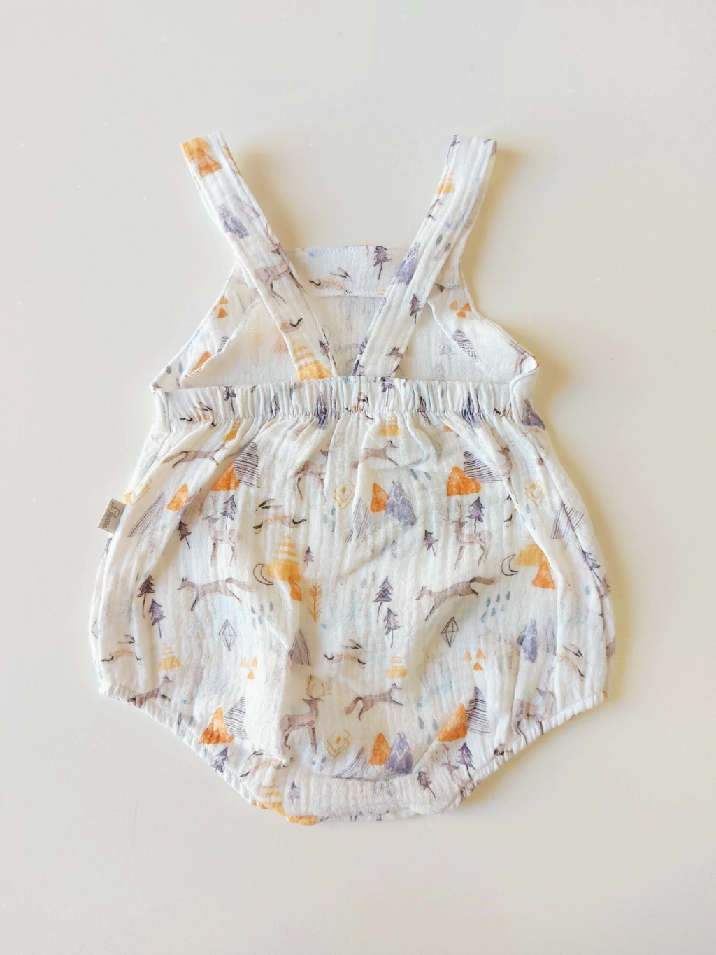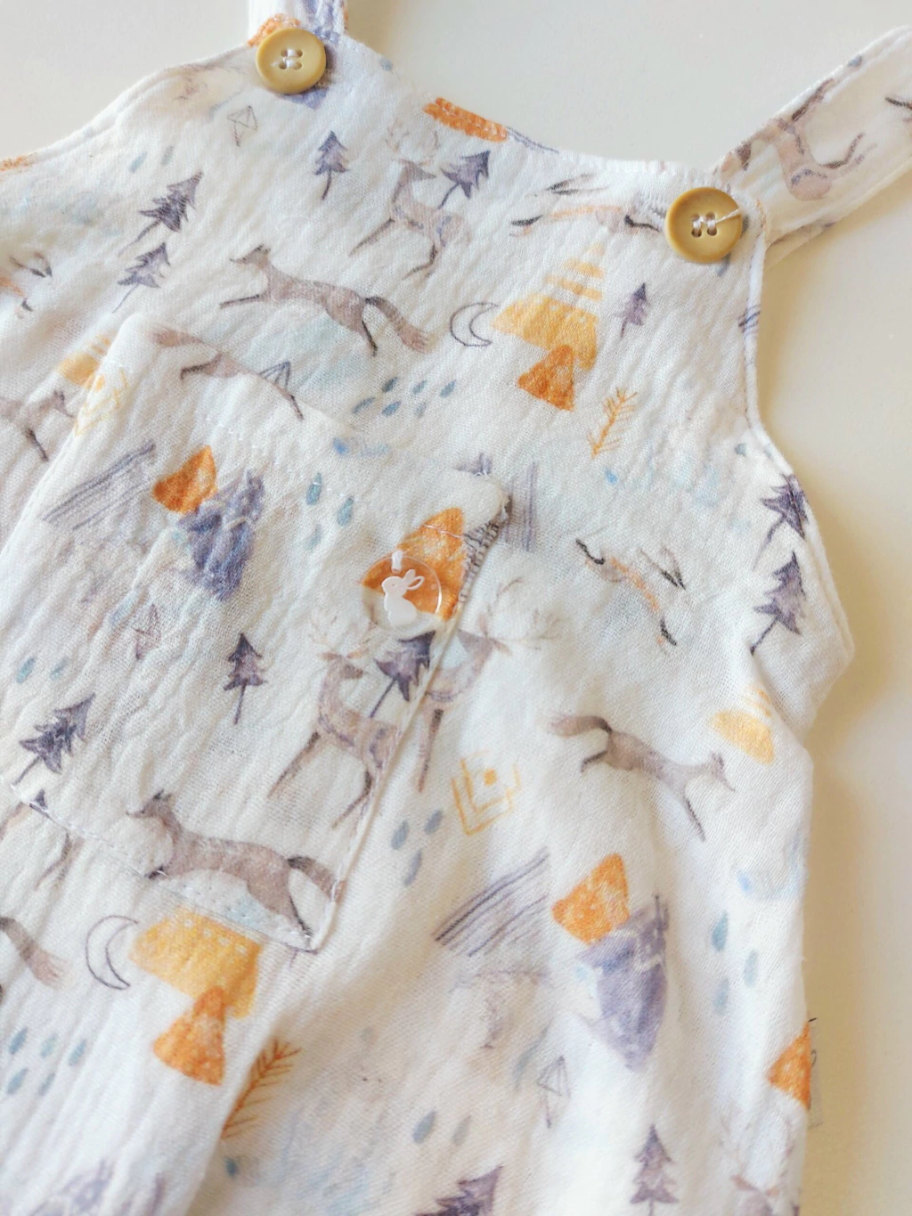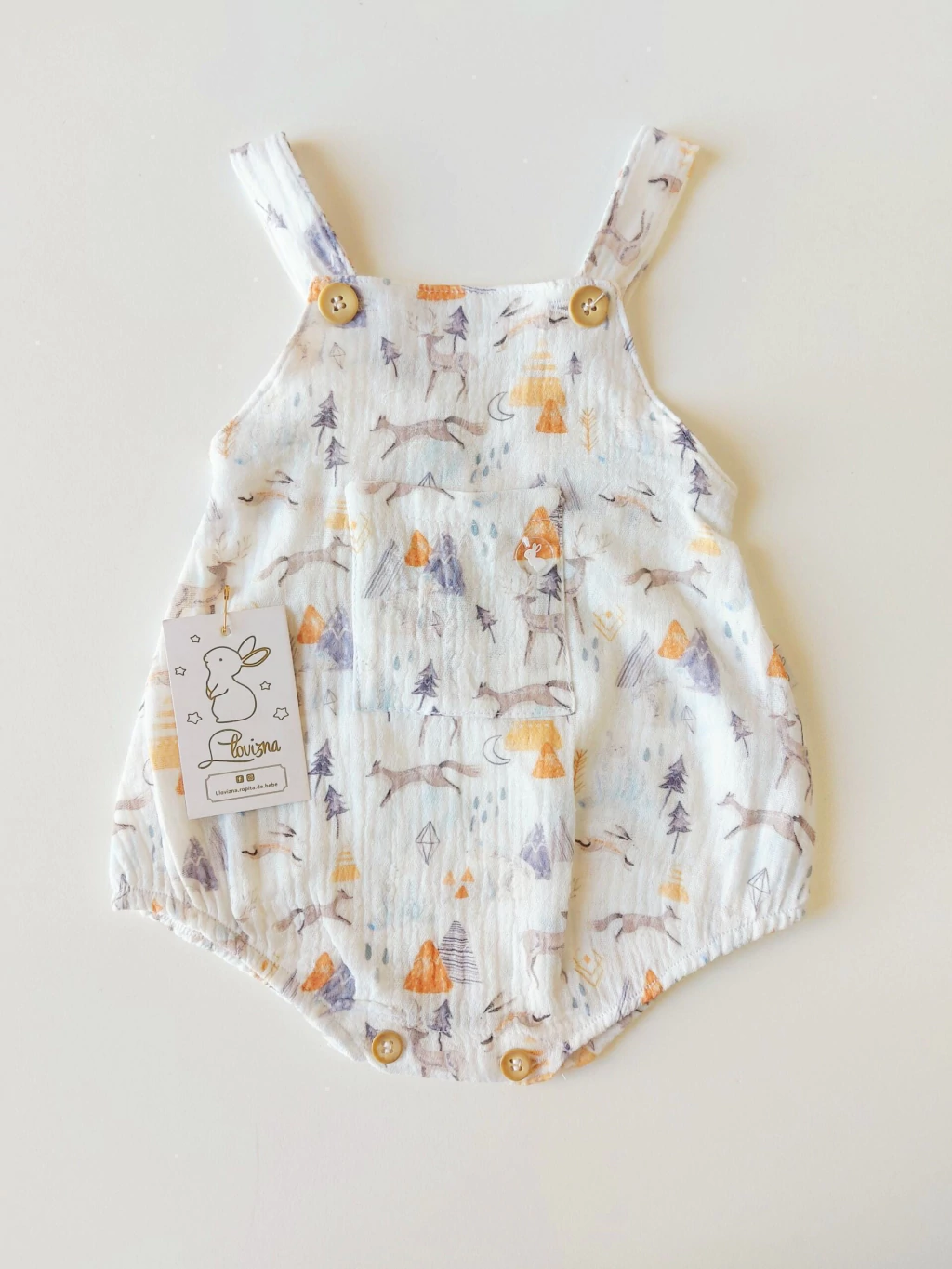 Este hermoso enterito de tirantes está confeccionado en gasa de excelente calidad, súper fresco, suave y cómodo para los días de verano. Sus botones delanteros y broches en la parte inferior permiten una colocación práctica y rápida, mientras que su bolsillo frontal le suma un detalle adorable.