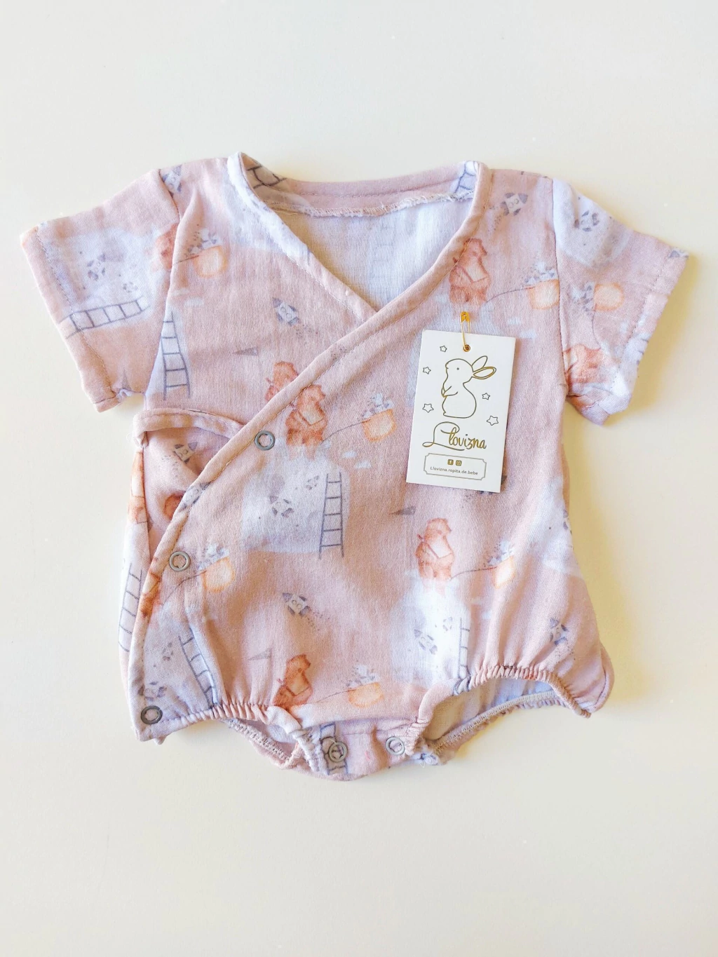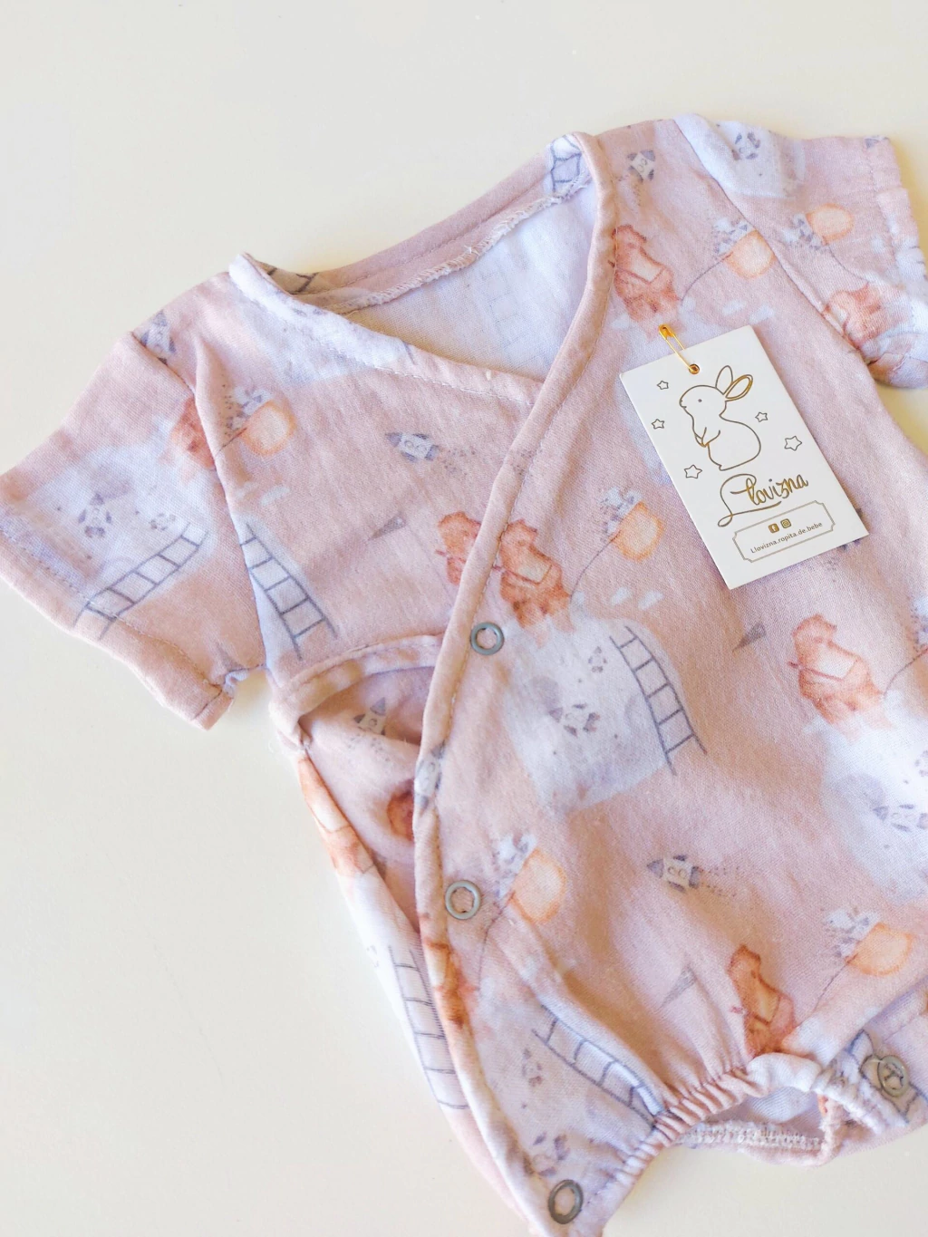 Este hermoso body cruzado de mangas cortas, confeccionado en gasa de excelente calidad, es ideal para brindarle frescura y suavidad a tu bebé en los días más cálidos. Su práctico cierre con broches permite vestirlo de manera rápida y sencilla, cuidando siempre su comodidad.